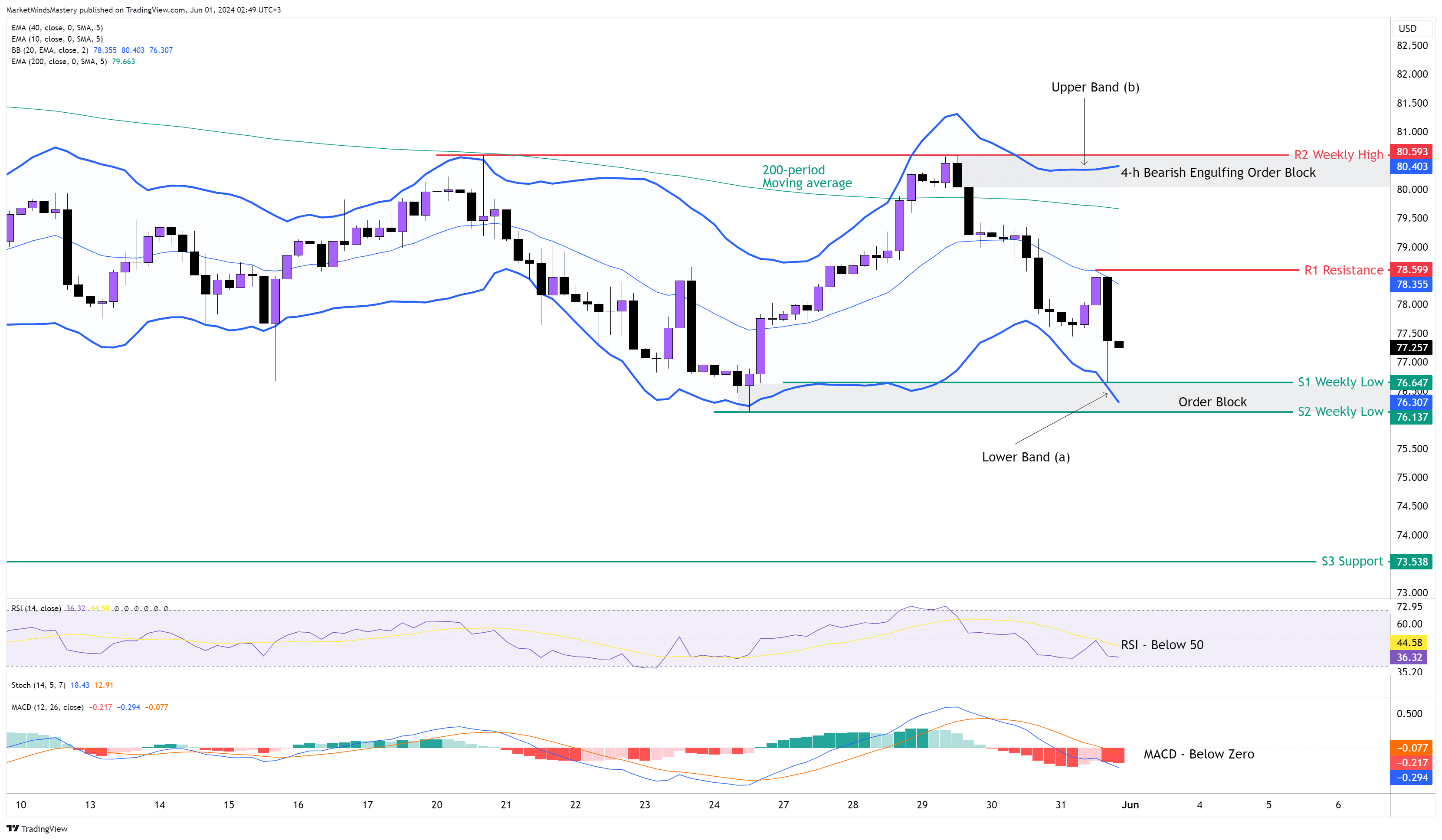 Il MACD è al di sotto della linea dello zero, il che ha implicazioni ribassiste. Il prezzo è sotto la metà della Banda di Bollinger, la media mobile a 20 periodi. La banda inferiore in (a) si è allargata venerdì scorso quando il prezzo si è mosso al ribasso, mentre la banda superiore in (b) è rimasta piatta. Se si verifica un movimento dinamico verso il basso, la banda superiore deve puntare verso l'alto. Questa indicazione è una delle parti più importanti della strategia delle Bande di Bollinger. Indica se il mercato è in grado di seguire il movimento del prezzo. Se il prezzo si muove verso il basso, la prima area di supporto, S1, sarà il minimo della settimana precedente, intorno a 76,64 dollari. Se il prezzo si rompe e chiude al di sotto di S1 e si muove verso il basso, il supporto successivo, S2, è il minimo settimanale precedente, intorno a 76,13 dollari. Tra S1 e S2 si trova un Order Block. Se il prezzo trova un supporto, rimbalza e si muove verso l'alto, la prima area di resistenza, R1, sarà a 78,59 dollari. Se il prezzo penetra la R1 e si muove più in alto, la prossima resistenza, R2, sarà il massimo della settimana precedente, intorno agli 80,59 dollari;