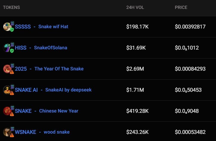Một token trên Solana có tên "The Year of the Snake" từng đạt vốn hóa $1,7 triệu trước khi tụt xuống dưới $1 triệu.