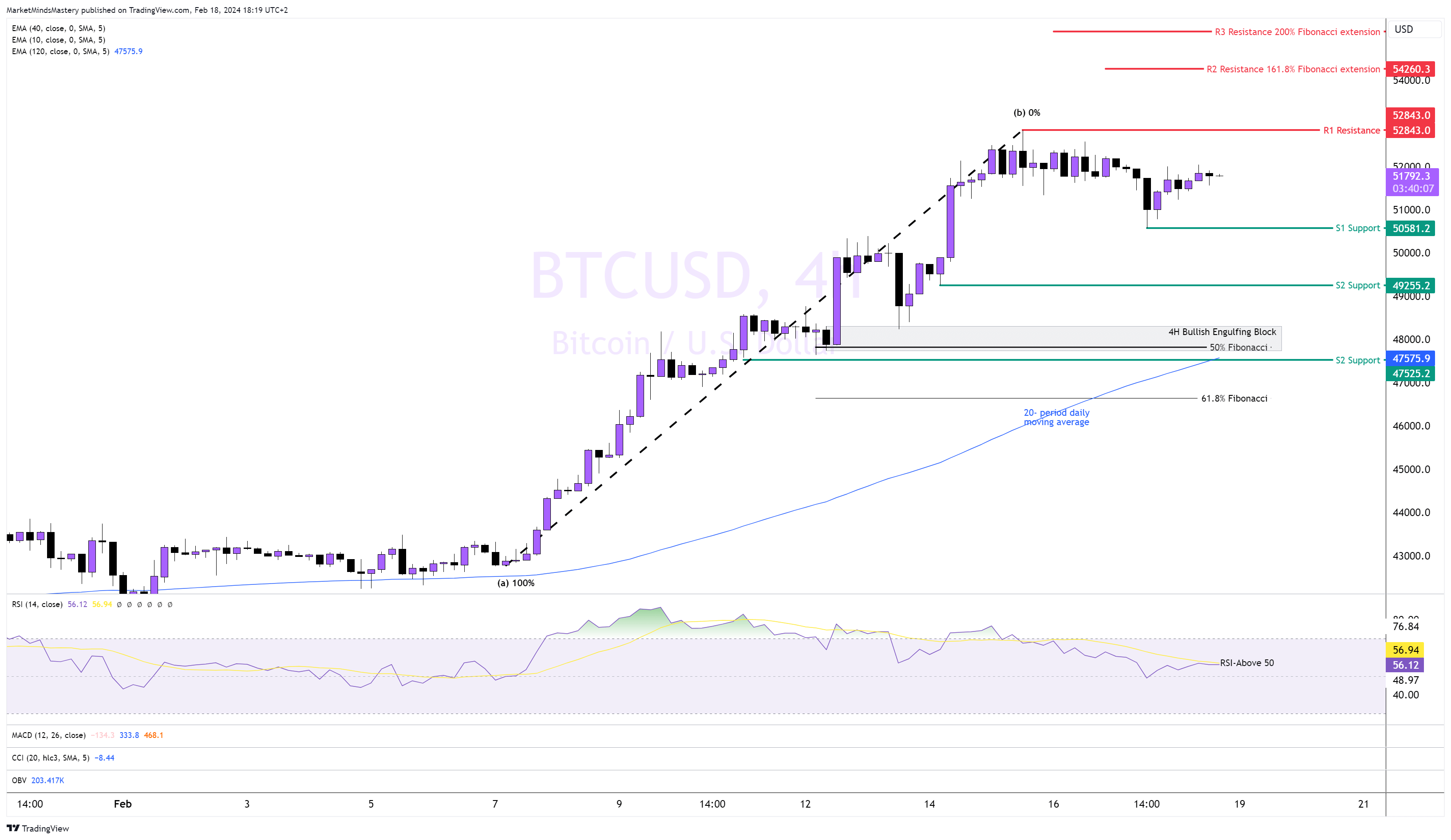Bitcoin has been experiencing enormous appreciation and increased volatility lately. The price is rising, and more extended, bullish candles are printed on the charts than bearish candles. These shallow retracements indicated that buyers are aggressive and willing to bid higher prices within a minor correction. The RSI is above 50, and this is bullish. However, as per the oscillator, it also does it at a weak pace. If the price moves downwards, the first support is the S1, which is around $50580. A break below the S1 and a close on two consecutive days can lead the price to the next area of support, the S2, around $49255. A further decline will meet the 50% retracement based on the Fibonacci impulsive move from point (a) to point (b). This area also hosts the bullish engulfing candle block that started the last recent trend leg. Conversely, if the price moves upwards, the first resistance is the R1, which is around $52843. If the price moves above the R1, the 161.8% Fibonacci extension can be used to find the R2 resistance above the $54000.