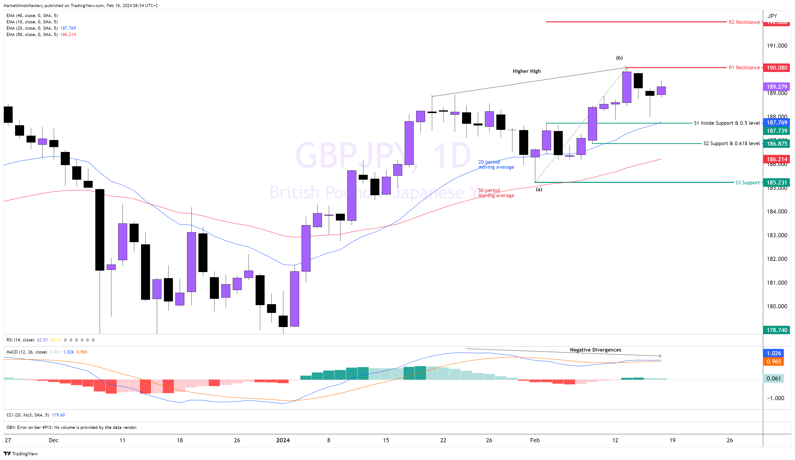 The price created a higher high, and the MACD didn’t follow through, producing a lower high. This disagreement shows a lack of momentum on the last upward move. If the price continues increasing, the first resistance area, R1, becomes the most recent swing high, around the 190 price level. If the price decisively penetrates the R1 and closes above it, the next resistance area, R2, is around 192. If the price declines and moves lower, the first area of support, S1, is also inside support, as per the chart around 187.739, consisting of the Fibonacci retracement of 50% from the swing point at (a) to point (b). If the price continues moving lower, the next support, S2, is approximately the 186.87 level, consisting of the Fibonacci Golder ratio of 61.8%.