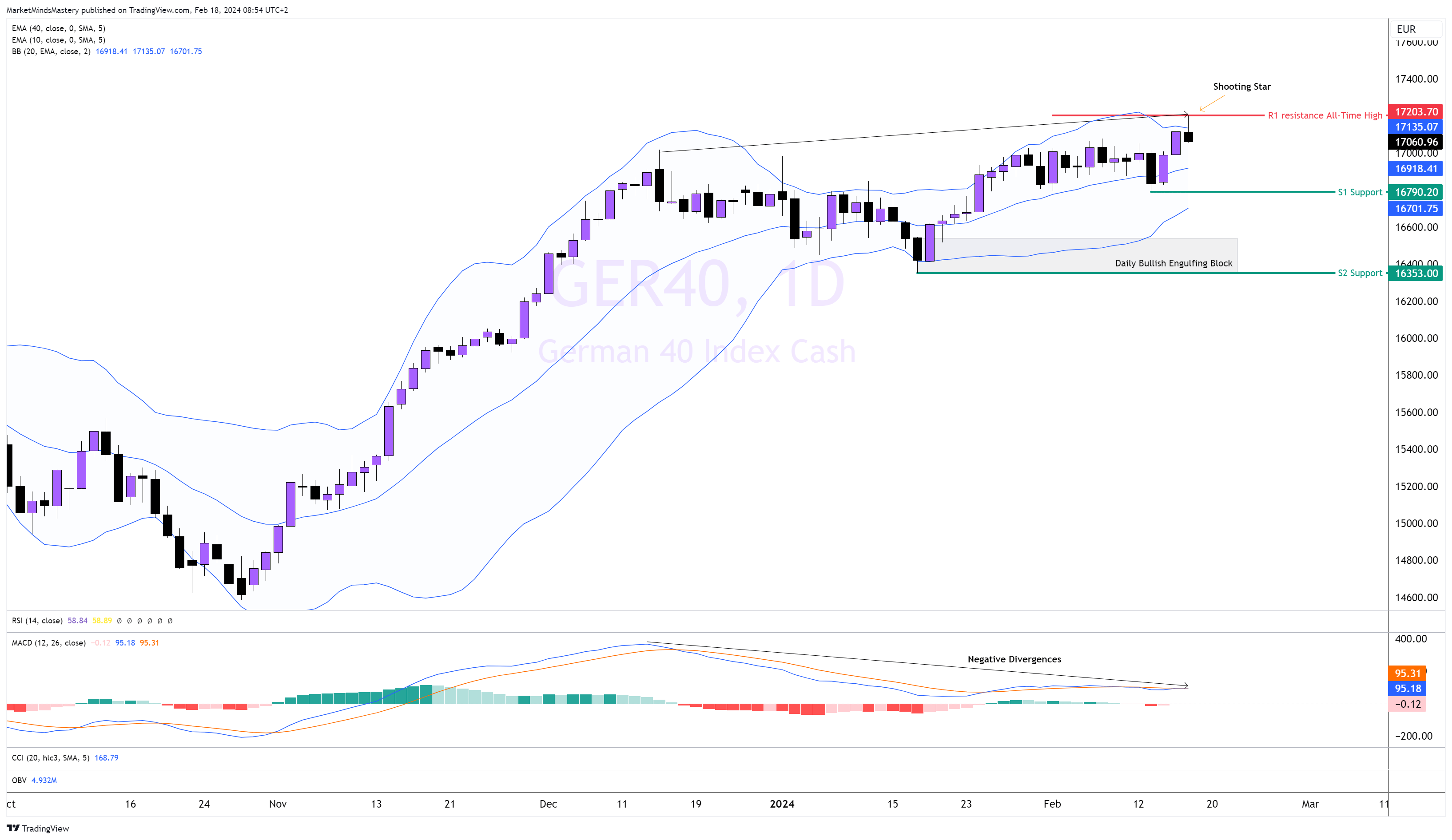 Following the surprising news events of last week, the price of the US30, on the 4H chart, printed a bearish marubozu candle. The price found support around the 38000 level and bounced upwards with a bullish reversal hammer. The price could not create a new all-time high, and the market sold off at the bearish engulfing block area between 38700 and 38800 last week. Since then, a long, bearish engulfing candle was created, indicating that the sellers were willing to defend that area. The (OBV) Balance Volume declines, showing that more money moves out of the market than money flows into the market. This is also a bearish indication. If the price moves lower, the first area of support, S1, is a daily low of approximately 38190. A close below it and a further decline will find the next level of support, S2, to be the previous month's low, around 38000. This round number can bring significant trading engagement as it is a round number and attracts attention. If the price bounces off and moves upwards, the first area of resistance, R1, is approximately 38800. If the price penetrates the R1 and moves higher, the next resistance area is the R2, around 38928, the all-time high price.
