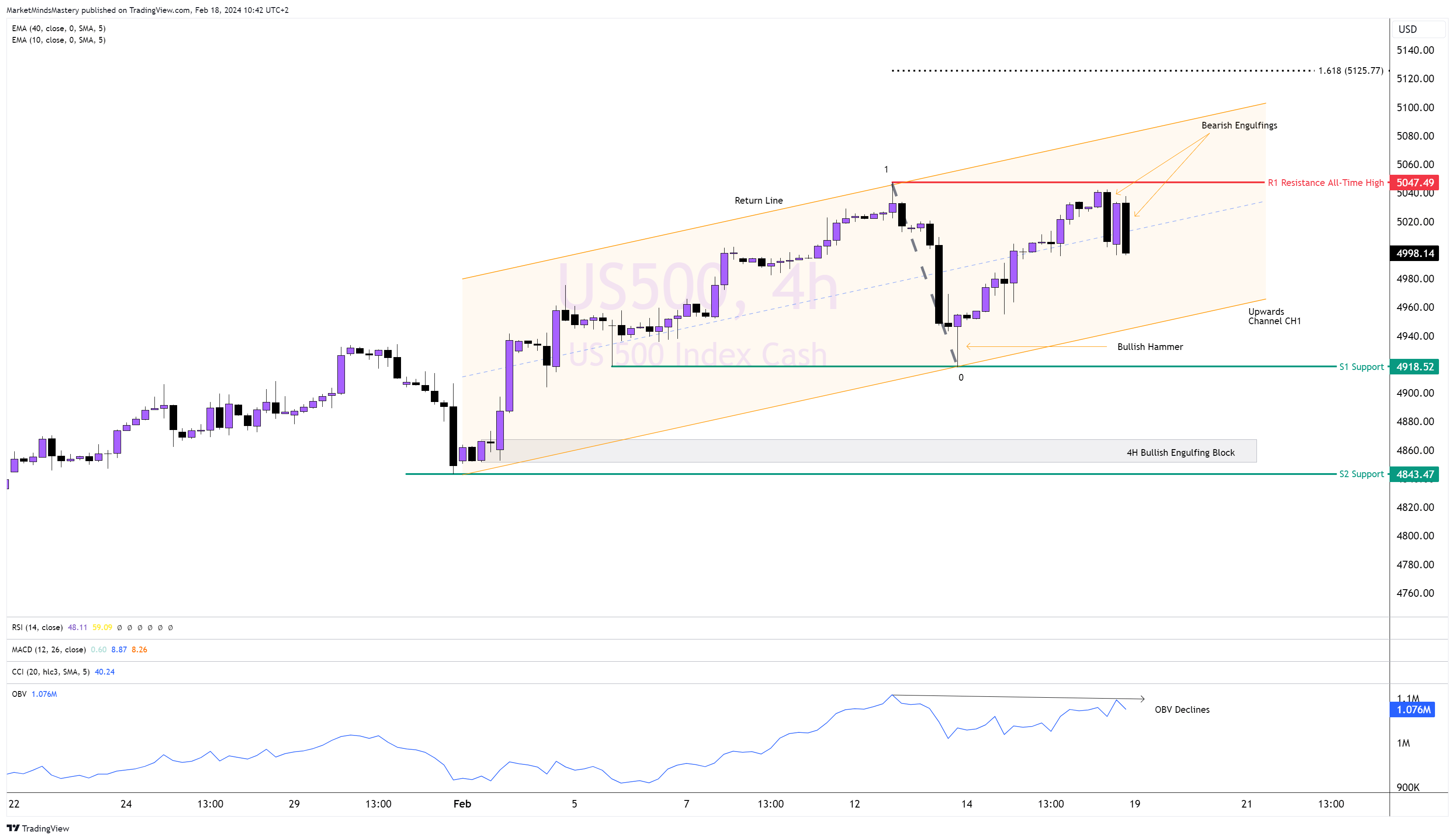 Following the long-term uptrend, last week's price created a new all-time high, above the 5000 level and then retraced backwards. The price then found support at the S1 around the 4918 and bounced off. Therefore, an upward channel, CH1, is created—the price has since tried to make a new high and failed just below the R1 resistance. The price declined, and two bearish engulfings with long bodies were printed. At the same time, the On Balance Volume indicator declined, which is a bearish indication. If the price moves lower, the upward trendline of channel CH1 can act as support. The following static support, S1, is approximately the 4918 level. If the price keeps declining and moves below the S1, the next area of support, S2, is around 4843. At this level, as shown on the chart, multiple bullish engulfing blocks were created by the price, making this level significant for the time being.