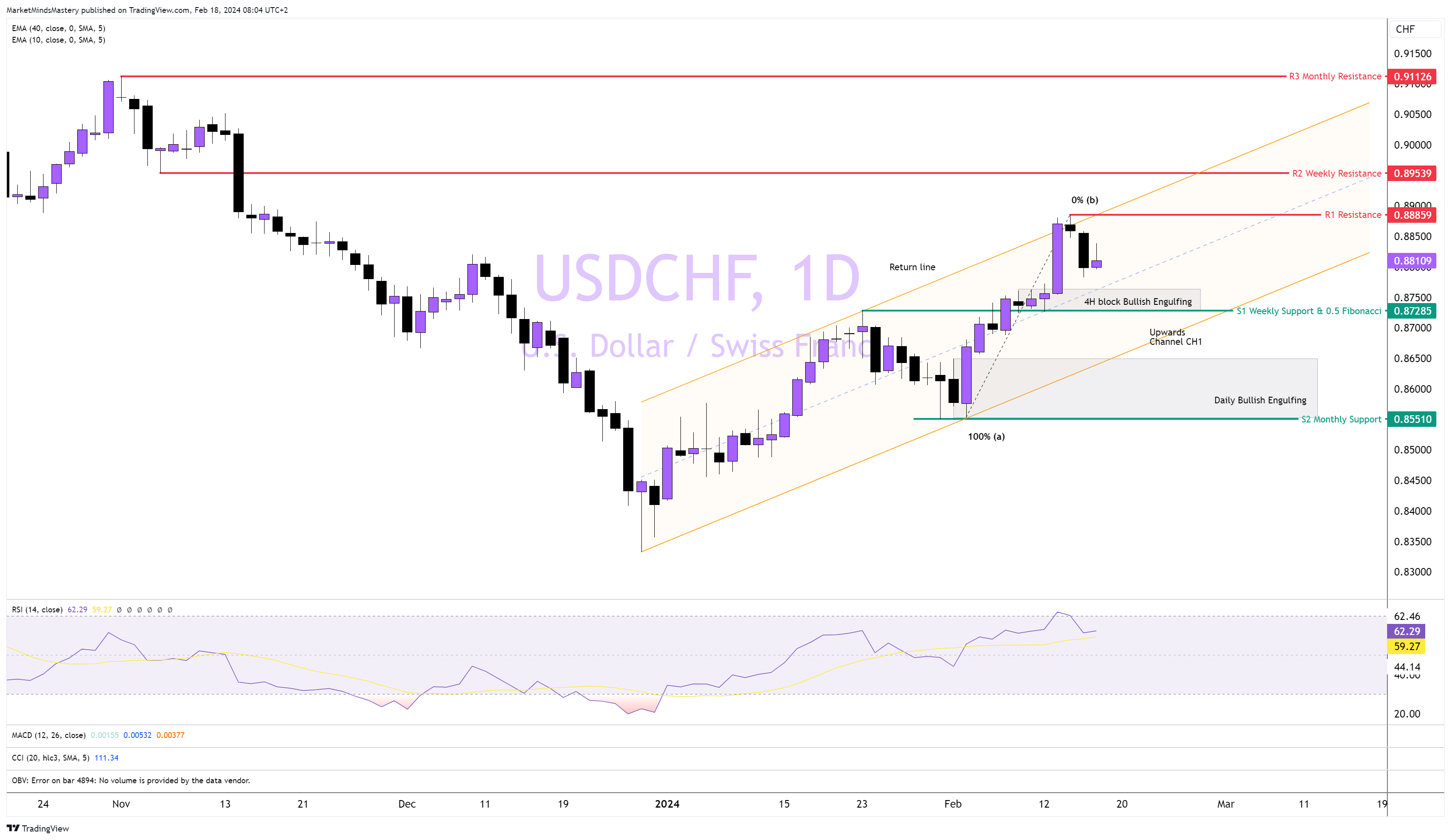 If the price moves upwards, the most recent swing high around 0.88859 is the first R1 resistance. If the price breaks and moves higher, the next resistance, R2, is approximately 0.89539.
