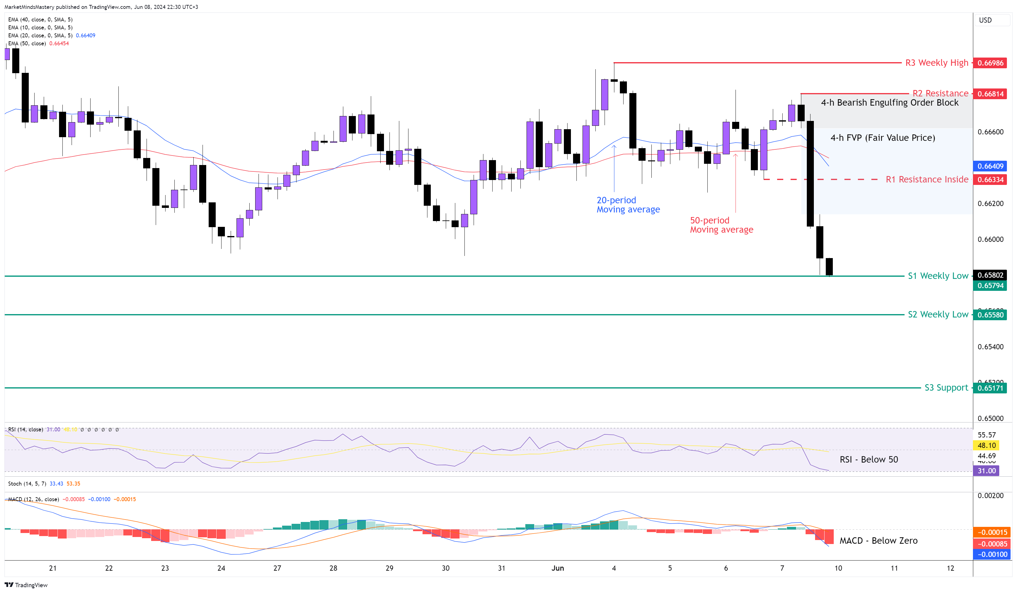 从周一开始,如果价格继续走低,第一个支撑区域在0.65794附近。这是上周的低点,目前价格正位于其上。如果价格击穿 S1 并下行,下一个支撑区域 S2 将是 0.65580。另一方面,如果价格上行,第一个阻力区 R1 将在 0.66334 附近。如上图所示,这是一个内阻力位,位于FVP内。如果价格击穿 R1 并继续上行,下一个阻力区 R2 将位于 0.66814 附近,同时会出现一个看跌吞没订单区;