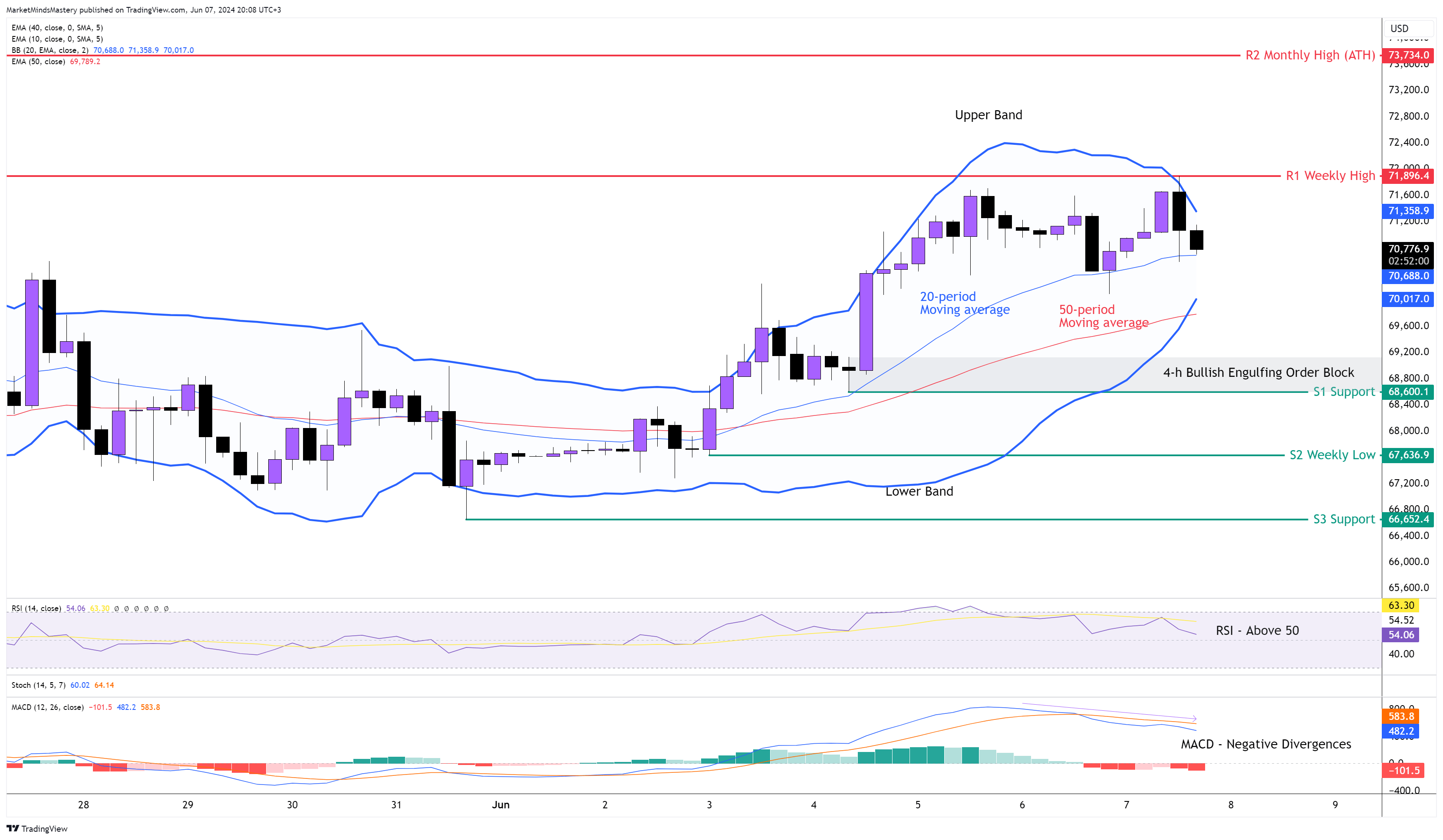 另一方面,如果价格下跌并向下移动,第一个支撑区 S1 将是 68,600 美元。在这一水平,有一个看涨吞没订单区。如果价格跌破 S1 并进一步下跌,下一个支撑区域 S2 将在 67,630 美元左右。这是上周的最低价。在其下方,我们会发现支撑区域 S3,位于 66,650 美元附近。