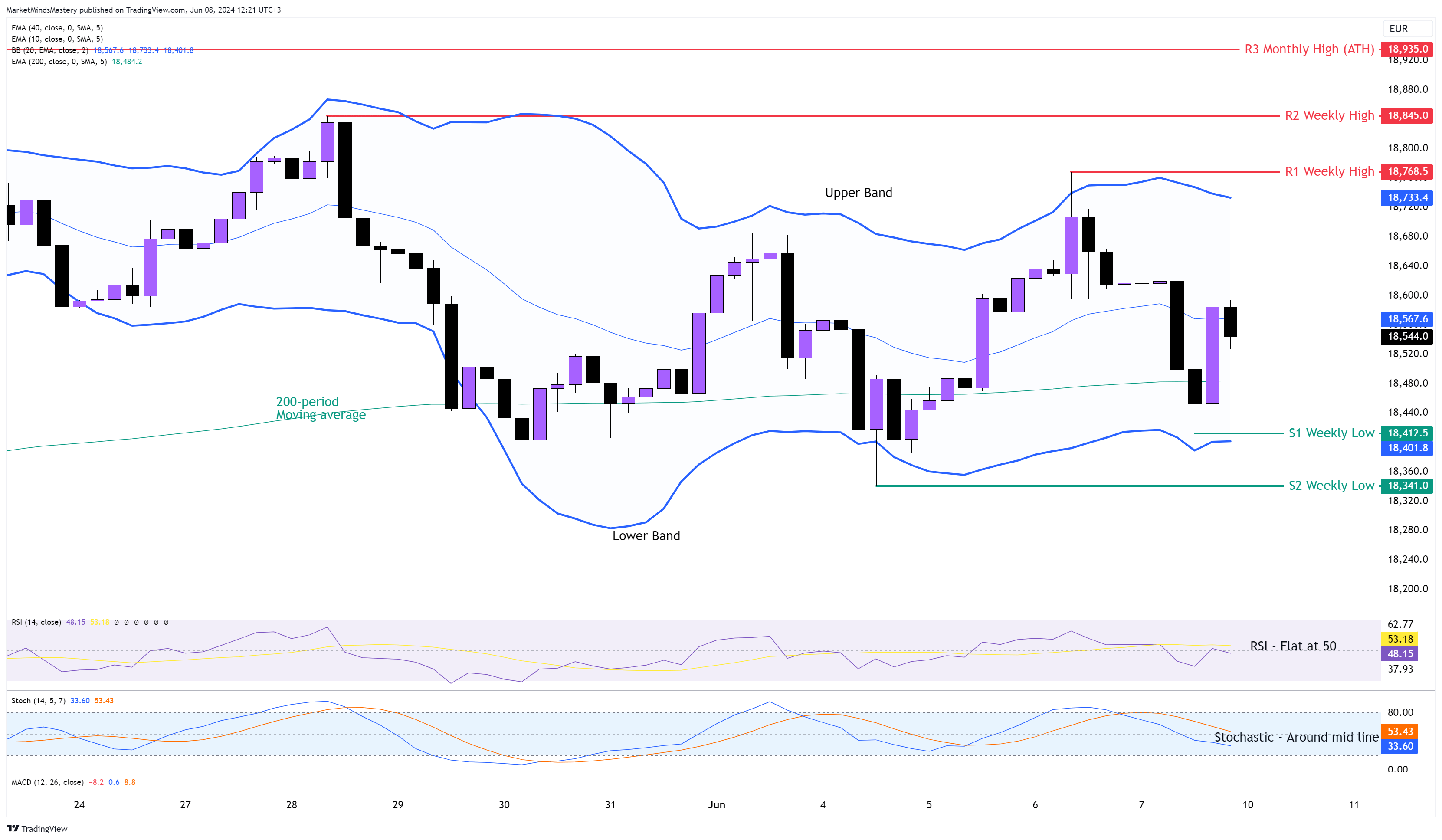 另一方面,如果价格下行,第一个支撑区域 S1 将是前一周的低点,大约在 18412 附近,这也是布林线的下轨。如果价格进一步回落,下一个支撑区域 S2 将在 18341 附近;