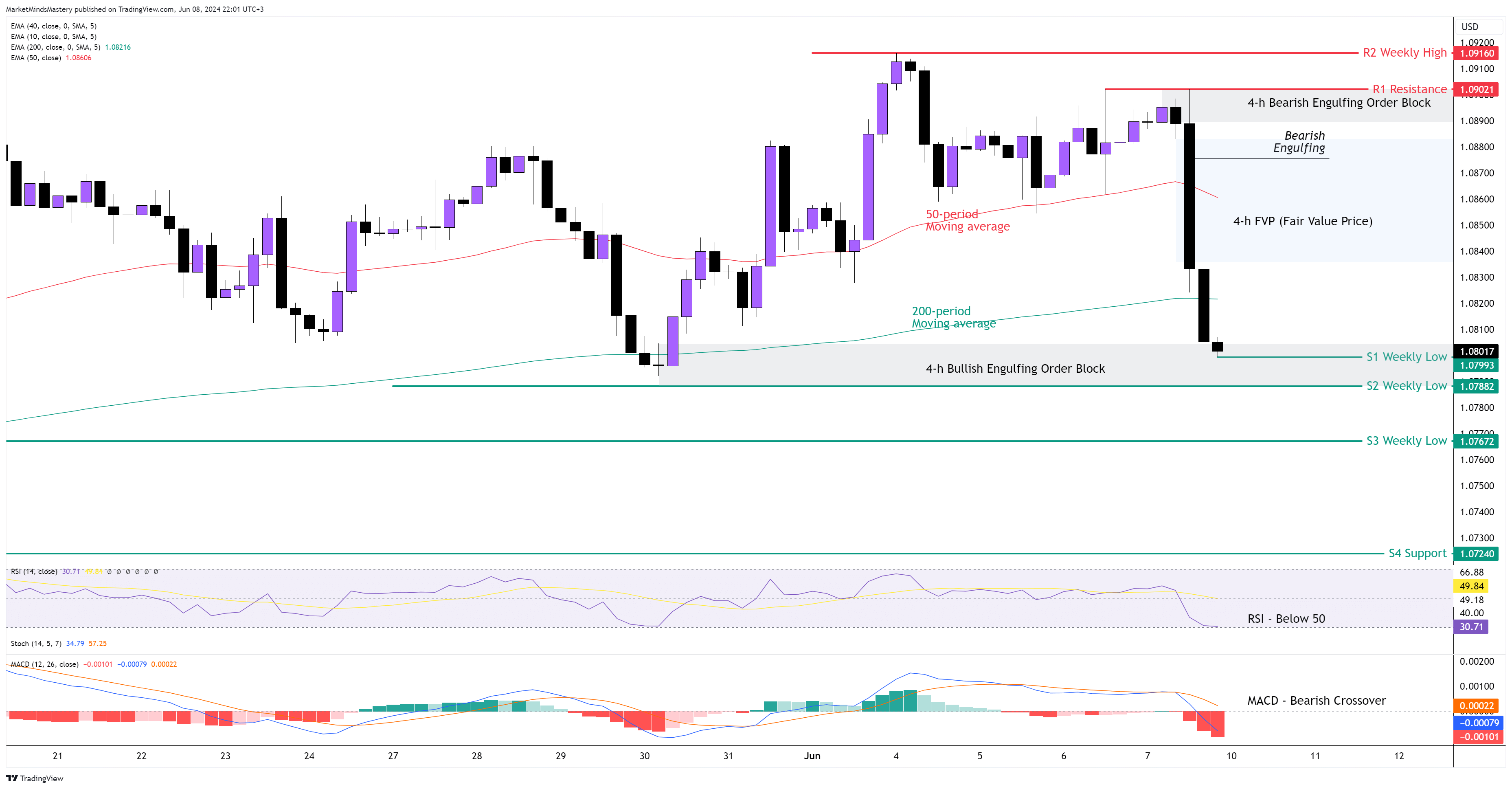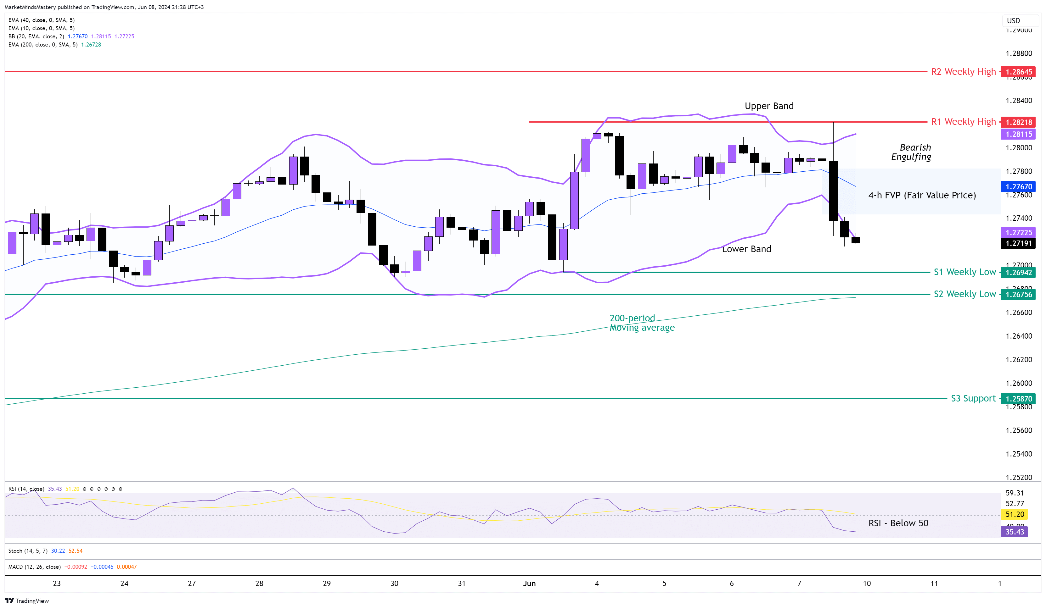 上周五的NFP(非农就业)报告公布后,美元追随积极的结果,获得了巨大的力量,导致欧元在第一分钟内下跌了约50点。这为当天交易的剩余时间定下了基调。这一动态下行走势导致价格进入看跌吞没指令区,该指令区在上一周的市场展望中被标出,目前仍然有效。4H 图表仍处于区间市场结构中。目前,价格收于200 期移动平均线下方,具有看跌含义。要使市场具有趋势倾向,价格必须跌破图表所示的 S2 周支撑位,或突破 R1 周高点。RSI低于50表明市场看跌,同时,MACD在0上方形成看跌交叉,这也具有看跌含义。