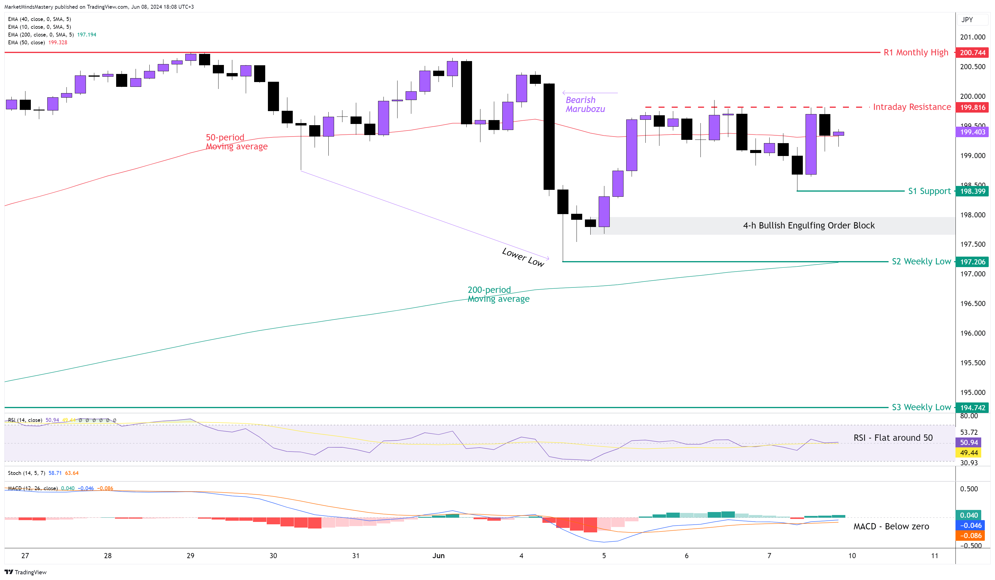 由于周线图以另一个悬挂者反转结束,因此,如果价格被拒绝并走低,第一个支撑区域 S1 将是 198.39。如果击穿 S1 并下行,价格将在 198 附近进入 看涨吞没订单区。