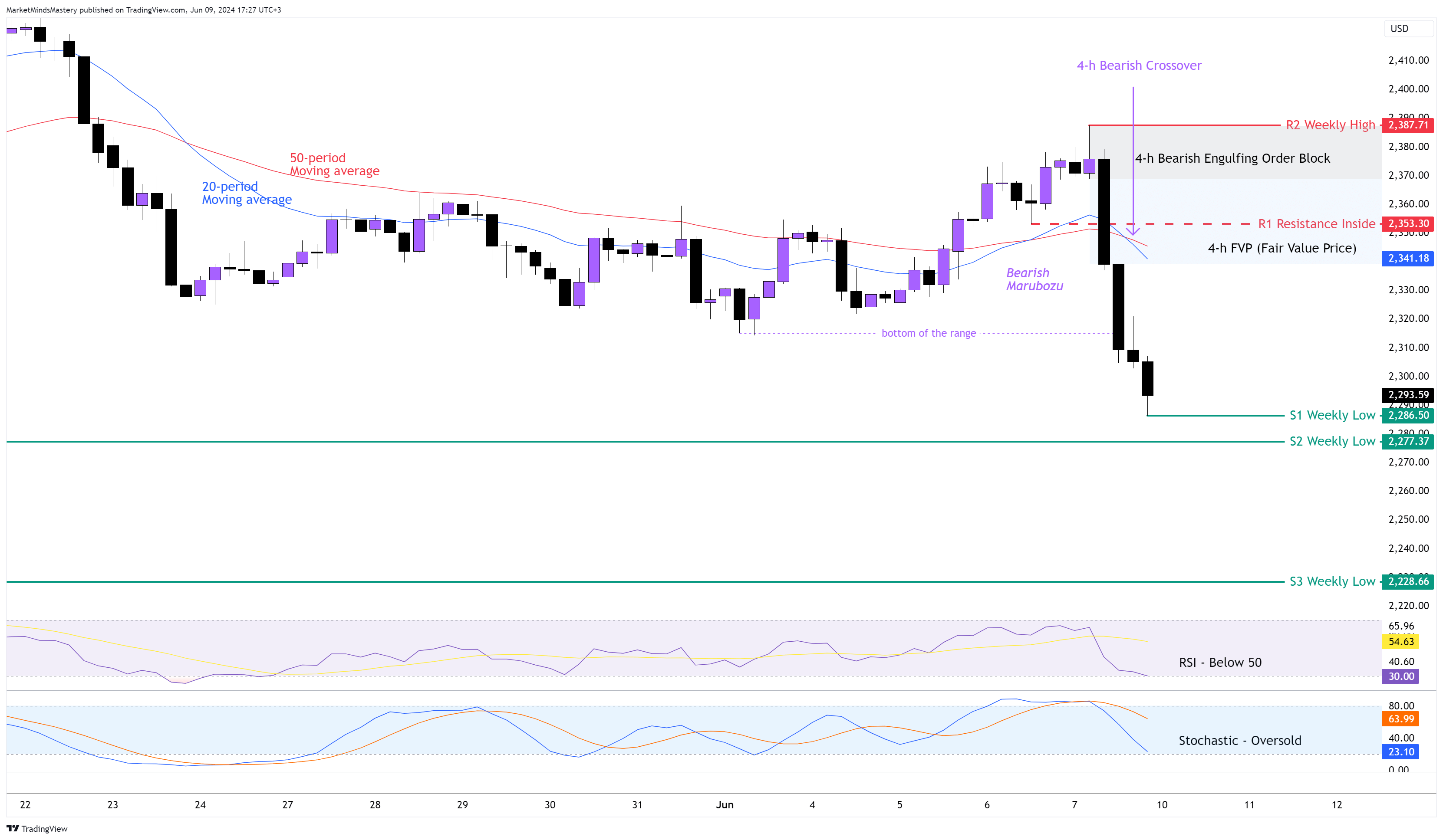 20周期移动平均线在50周期移动平均线下方交叉,称为看跌交叉。RSI振荡器低于 50,几乎超卖,随机振荡器也几乎超卖。两者都有看跌含义。根据摆动分析,造成这一下跌走势的摆动留下了一个看跌吞没订单区和一个FVP(公平价值价格)。