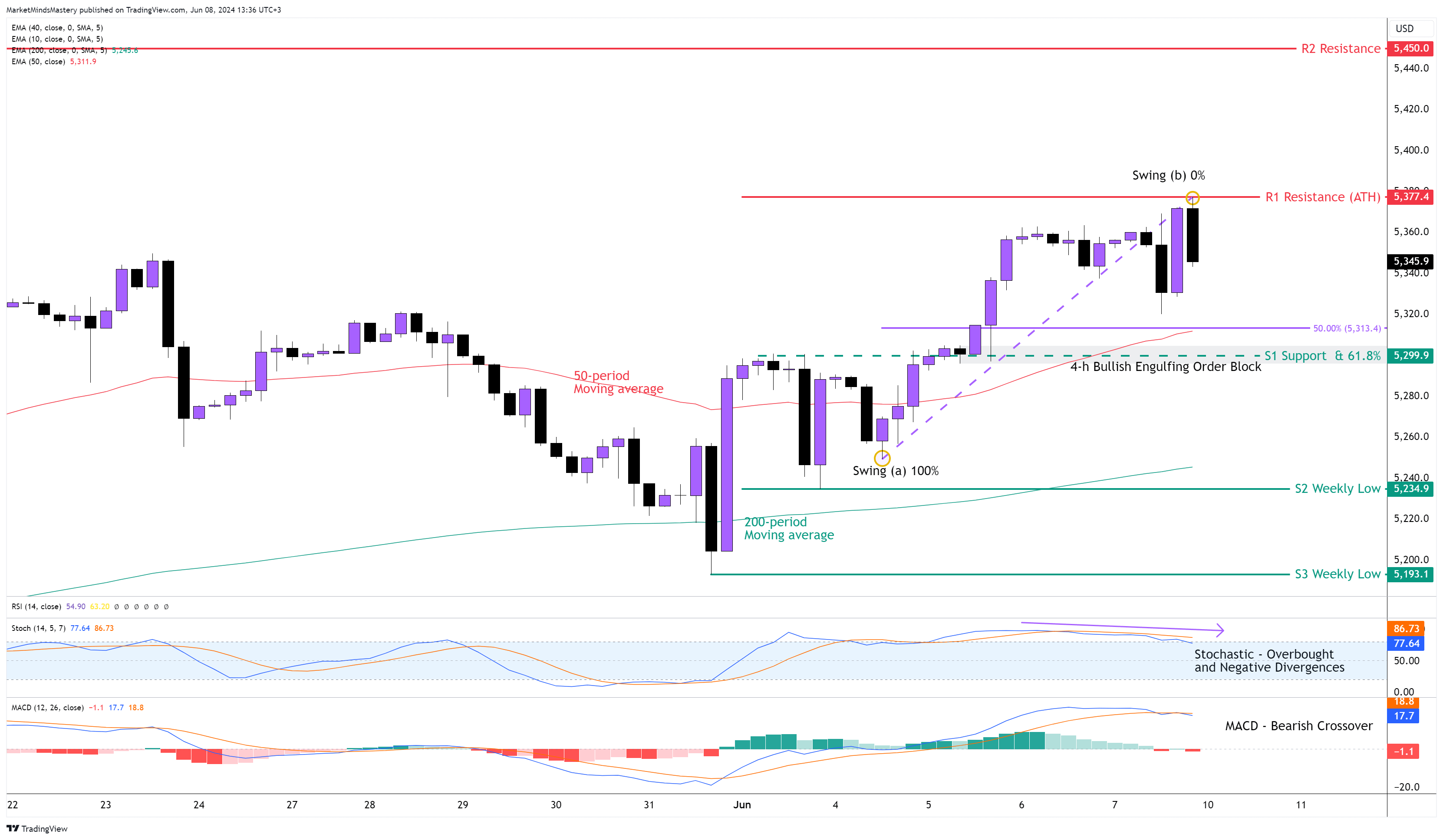 如果价格下行,第一个支撑区域是 S1 的内部支撑、50 期移动均线、4H 看跌吞没订单区和61,8%斐波那契水平的汇合。如果价格没有从这一水平反弹继续上行并进一步下跌,下一个支撑区域 S2 将是前一周的低点 5235 附近。