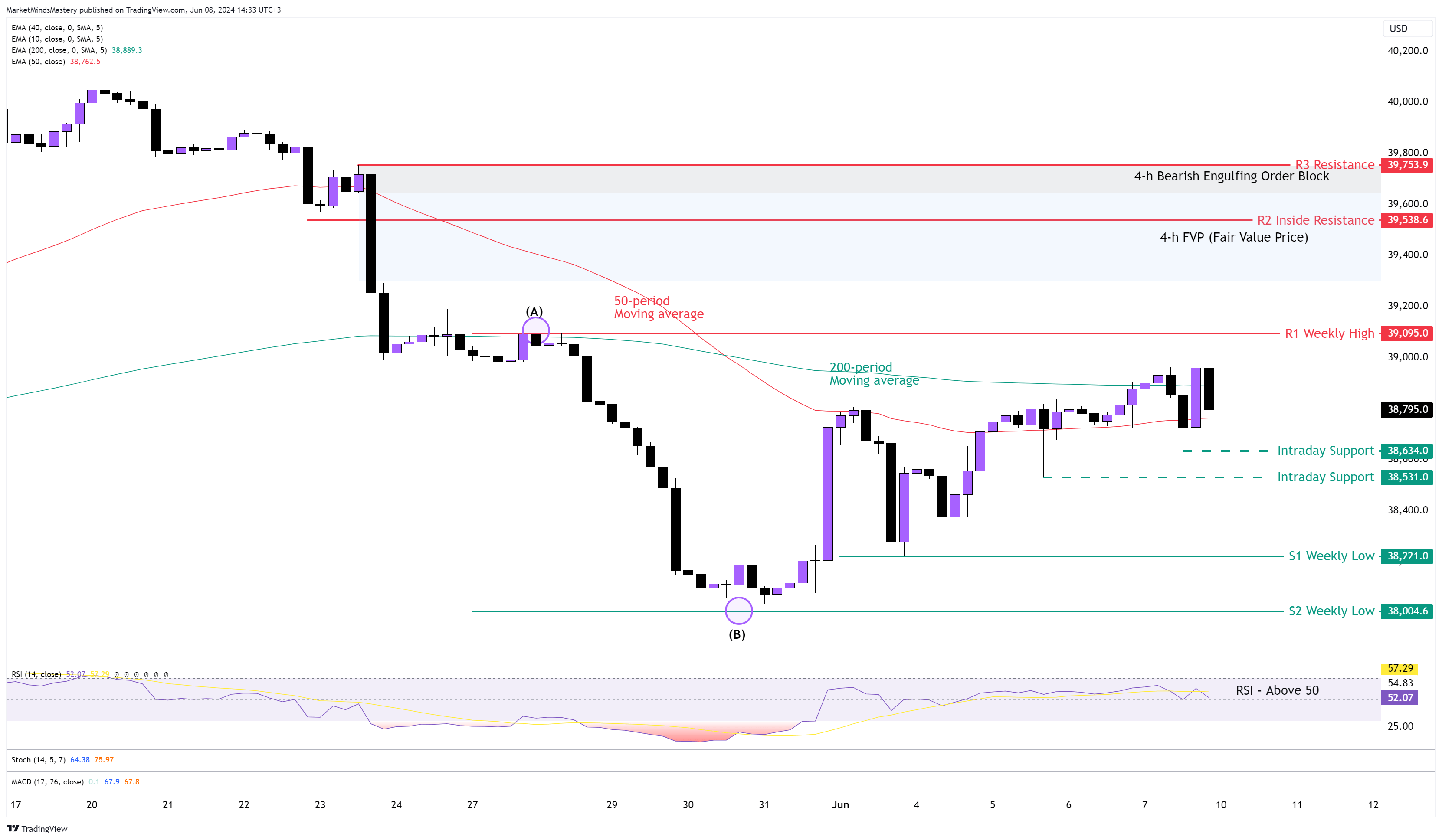 如果价格被拒绝并向下移动,第一个支撑区域 S1 将是前一周的低点,约 38221 美元。如果价格击穿 S1 并走低,下一个支撑位 S2 将是 38000 美元整数附近,这是一个旧的周低点。