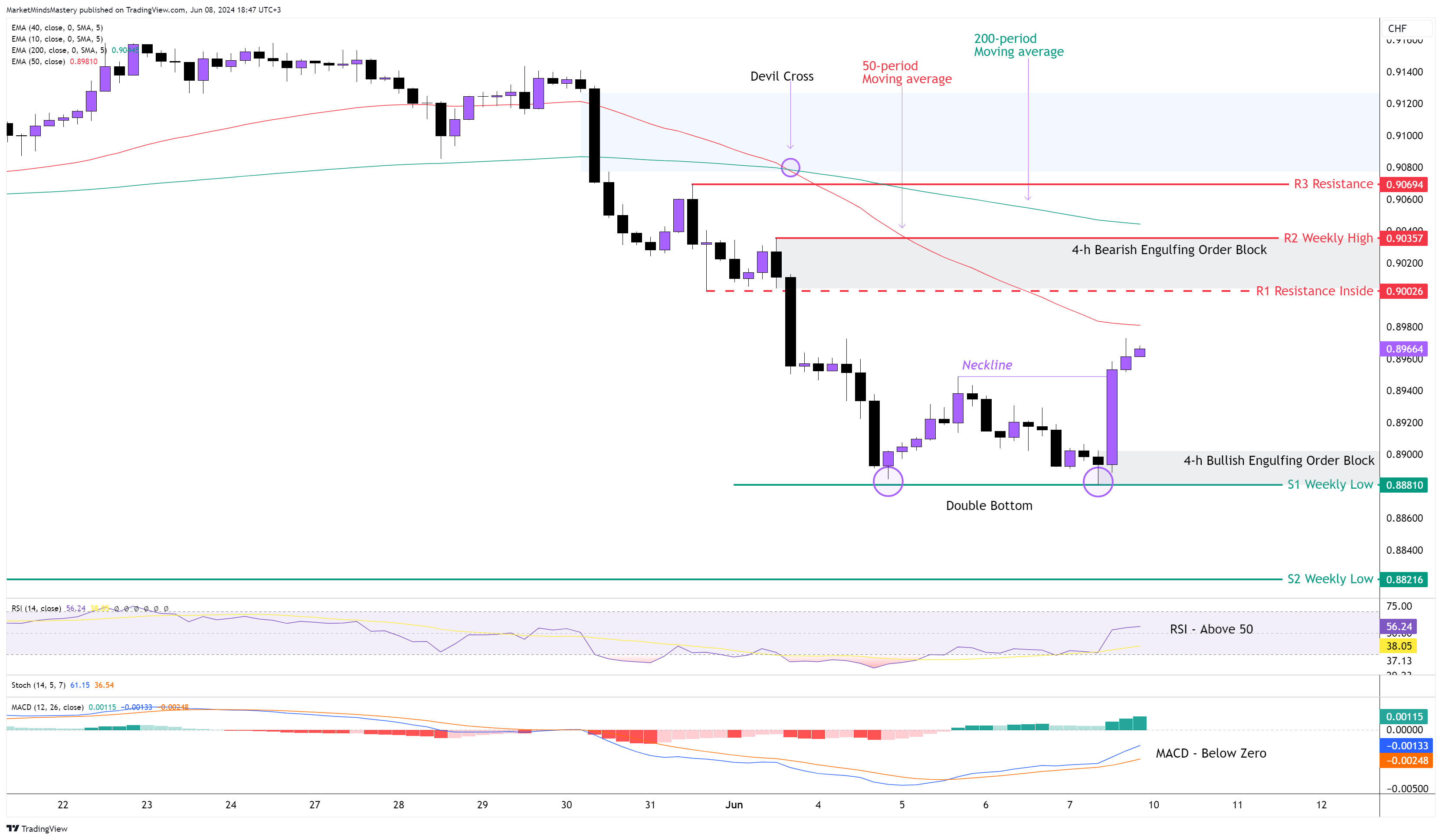 继前一周的市场展望之后,价格如期上行,进入看跌吞没的阶块区域并遭到拒绝,留下了一个看跌丸形。从那时起,价格形成了低点形态。50周期高于200周期移动平均线,具有看涨含义。RSI振荡器在中线附近持平,因为价格在过去近20个周期内横向波动。MACD也在中线附近走平,但仍低于零,这可以解释为看跌迹象;