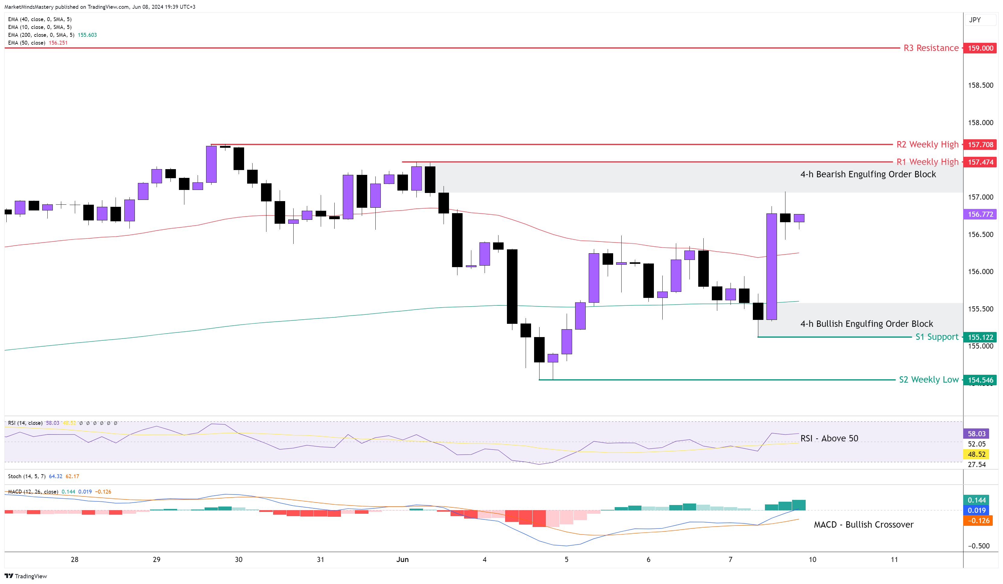 从周一开始,如果价格继续上行,第一个阻力区 R1 将是 157.47。这是上周的最高价,也是看跌吞没订单区的起点。R1 上方一小段距离是 R2 阻力区,位于 157.70 附近,这是另一个周内高点。另一方面,如果价格向下移动,第一个支撑区域 S1 将位于 155.122,即 200 期移动均线下方。在这一水平,上周五创建了一个看涨吞没订单区。如果价格在 S1 下方收盘并走低,下一个支撑区域 S2 将是上周低点 154.54 附近。