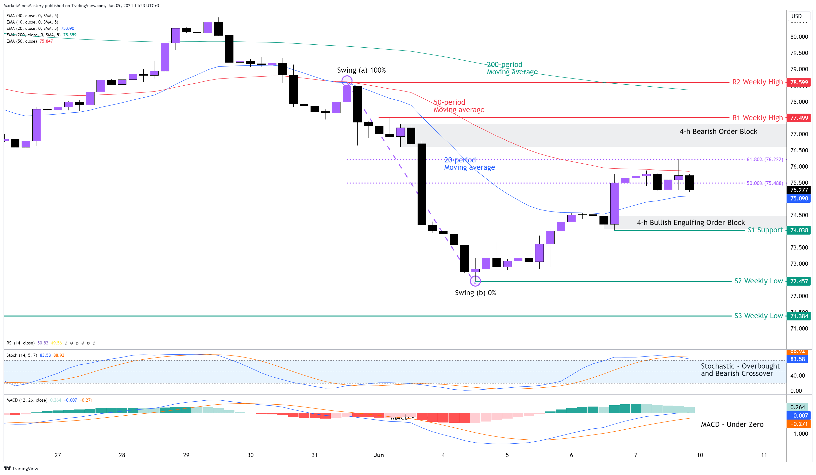 价格目前正触及 50 期移动均线和斐波那契回撤位 61.8%,即 黄金比率。如果价格被拒绝并向下移动,第一个支撑区域将是 74 美元,这一水平形成了 看涨吞没订单区。如果价格击穿 S1 并进一步下行,下一个支撑区域 S2 将是 72.45 美元,这是一周旧低价。如果跌破 S2,跌势将继续。另一方面,如果价格向上移动,则第一个阻力区 R1 将是 77.49 美元,即前一周的高点,那里有一个看跌订单区。如果继续上行,则会发现下一个阻力区 R2,约为 78.59 美元。